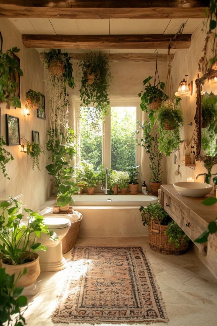 This bathroom transforms a daily routine into a magical experience by blurring the lines between a spa and a greenhouse. The foundation of the design is the textured plaster (or limewash) walls, which give the space an old-world, wabi-sabi feel that feels grounded and timeless. The exposed rustic wooden beams on the ceiling draw the eye upward and provide the perfect structure for the room’s main feature: an abundance of hanging plants.