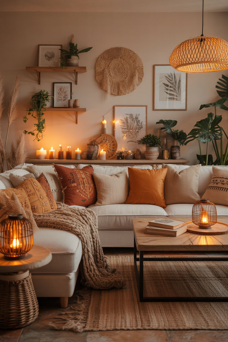 The magic here lies in the lighting. Instead of harsh overhead lights, the room glows with the warmth of multiple candles and lanterns placed at different heights, creating an intimate atmosphere. The chunky knit throw blanket draped casually over the sofa adds a layer of tactile luxury, inviting you to curl up with a book. Floating wooden shelves display curated botanical prints, keeping the walls interesting without feeling cluttered, while the woven pendant light ties the natural wood tones together.