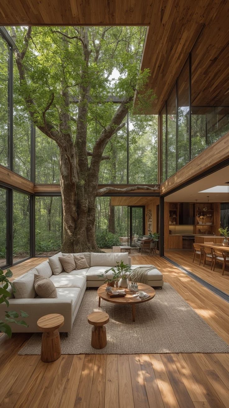 This living room is a masterclass in the Organic Modern trend. The architecture takes full advantage of the soaring double-height ceilings, clad in dark paneling that exemplifies the warmth of wood interior design. The heavy use of timber is perfectly balanced by the massive floor-to-ceiling windows, which dissolve the barrier between the cozy interior and the lush forest outside.